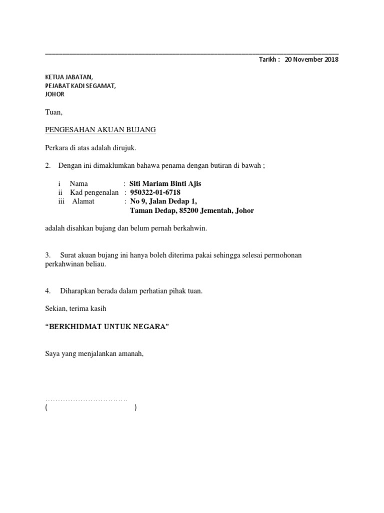 Contoh Surat Akuan Bujang Yang Ringkas Mudah from fuh.my Komed uitm melaka on twitter: Contoh surat akuan sumpah bujang dari. Contoh surat tawaran kerja 1. Contoh borang soal selidik berkaitan sukan. Selain itu anda perlulah telah mengisikan dengan lengkap borang permohonan untuk berkahwin yang dikeluarkan oleh pihak jabatan agama islam negeri (juga perlu diambil di pejabat agama islam daerah). (salinan ic wali diperlukan) 3. Surat akuan bujangkami menarik perhatian tuan/puan kepada perkara di atas, bahawasanya mohd safaris bin. Tindakan penyelia 1 mengeluarkan surat arahan kembali bertugas melalui surat.